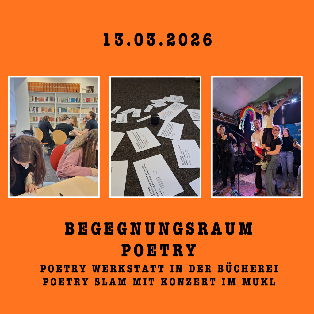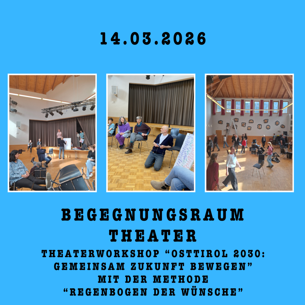 Neuigkeiten! Kommende Veranstaltungen ...werden bald bekannt gegeben 🙂 Vergangene Veranstaltungen Folgende Begegnungsräume haben schon stattgefunden, klick auf den Link und anschließend auf das Bild um hinzugelangen:Theater – Poetry – Vielfalt – Handwerk – Musik – Natur & Konsum – Meet&More – Jugendraum „Vida Loca“ – Instagramseite März 2026 Jänner 2026 November 2025 Wo steht die Skulptur aus dem Begegnungsraum Handwerk? Schau vorbei in der Pfarrkirche St. AndräAdresse: Patriasdorfer Str. 7, 9900 Lienz✔️ Vorherige Standorte: November 2025 – Jänner 2026: Bundesschulzentrum Lienz, Weidengasse 1, 9900 LienzKlick hier für noch mehr Infos zu diesem Begegnungsraum! Oktober 2025 September 2025 Juni 2025